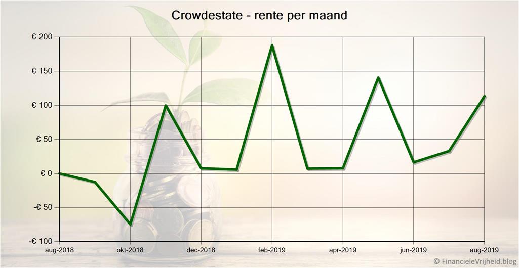 Bij Crowdestate heb ik afgelopen maand € 113,40 rente ontvangen. Het gemiddelde rendement is nu 10,6%. De sterk fluctuerende rente komt doordat een van de grotere projecten de rente per kwartaal betaalt in plaats van per maand.