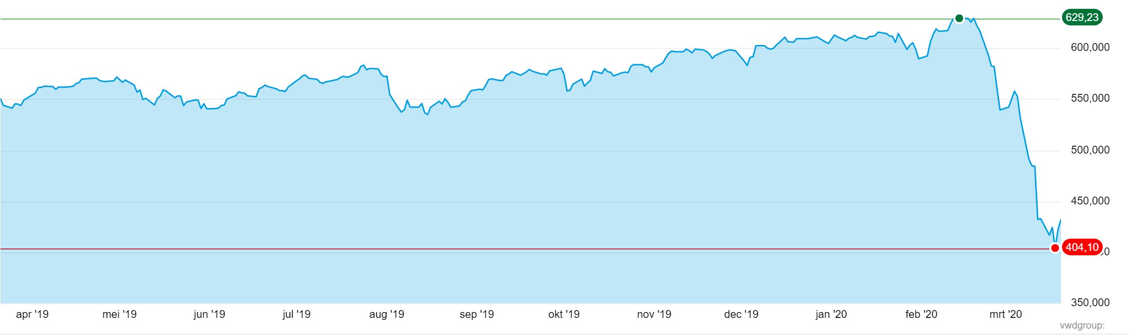 Inmiddels weten we allemaal hoe de maand maart verder verliep. De dag nadat ik ingestapt was werd bekend dat de eerste persoon in Nederland aan het virus was overleden. Ook in de rest van Europa sloeg de stemming om en werd het allemaal negatiever. Al snel daalden de koersen nog verder, en in de grafiek hieronder zie je hoe de daling verder inzette.