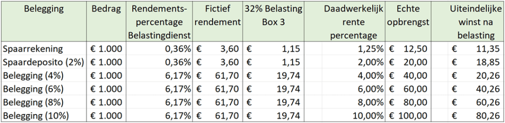 Voor elke 1000 euro boven de heffingsvrije voet zou je dan weer de eerdere tabel kunnen raadplegen. Dan krijg je grofweg een idee wat de impact van de belastingen in Box 3 zijn.