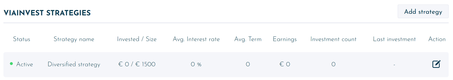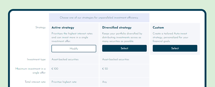Naast het zelf configureren kan je kiezen uit twee opties: ‘Active strategy’ en ‘Diversified strategy’. “Diversified” geeft denk ik de insteek wel goed weer, maar ik zet mijn vraagtekens bij “Active”. Beiden zijn ze natuurlijk actief, het verschil is dat Active denk ik net een stuk risicovoller is. Active focust op het pakken van de hoogste rentes, of er nou wel of geen buyback verplichting is. Ook is het maximum bedrag per investering hoger: 100 euro, terwijl Diversified maar maximaal 50 euro per investering doet. Dat zorgt er dus voor dat je geld over veel meer investeringen verspreid wordt en dat voelt beter. Best vreemd, om een strategy ‘Active’ te noemen als de tegenhanger daadwerkelijk meer investeringen moet doen om hetzelfde bedrag te investeren..