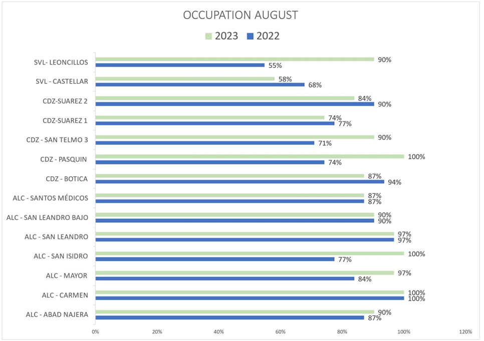 Brickstarter stuurt nu maandelijks een operationeel overzicht, met de inkomsten en bezettingen van de appartementen die worden verhuurd. Het bedrijfsmodel is het aankomen van panden, die een tijd verhuren en vervolgens als de waarde van het pand gestegen is deze op een gegeven moment te verkopen. De winst komt dus uit zowel huuropbrengsten als de waardestijging. Hier onder zie je bijvoorbeeld de bezettingsgraad van de appartementen in augustus, vergeleken met een jaar geleden. Gemiddeld is de bezettingsgraad met 8% gestegen.