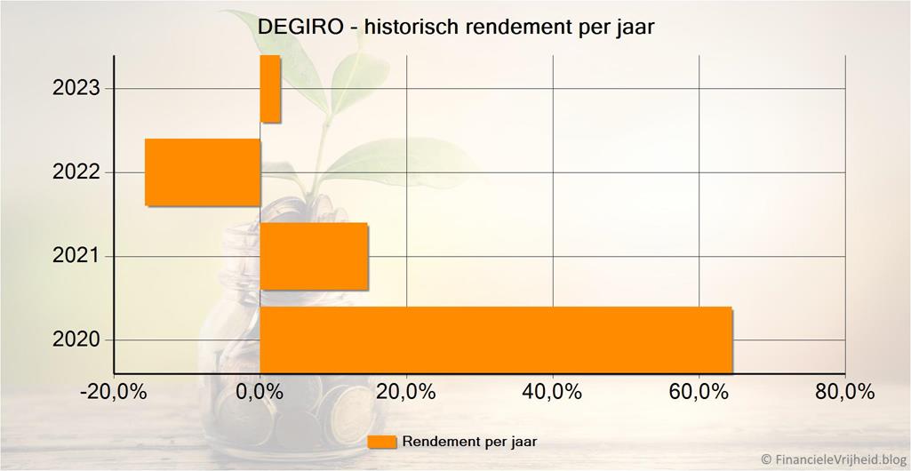 2023 laat een klein positief rendement zijn bij DEGIRO, na 2 jare ndie elkaar grotendeels gecompenseerd hebben. De grote klappers in 2020 staan gelukkig nog grotendeels overeind en zorgen voor een heel mooi historisch rendement.
