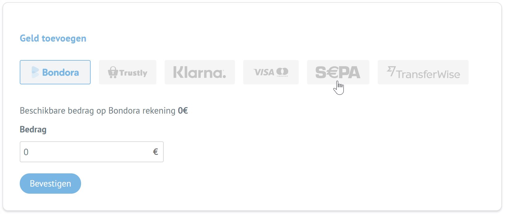 Geld storten kan met een normale bankoverschrijving. Klik links op de groene ‘Add money’ knop, en kies voor ‘SEPA’:
