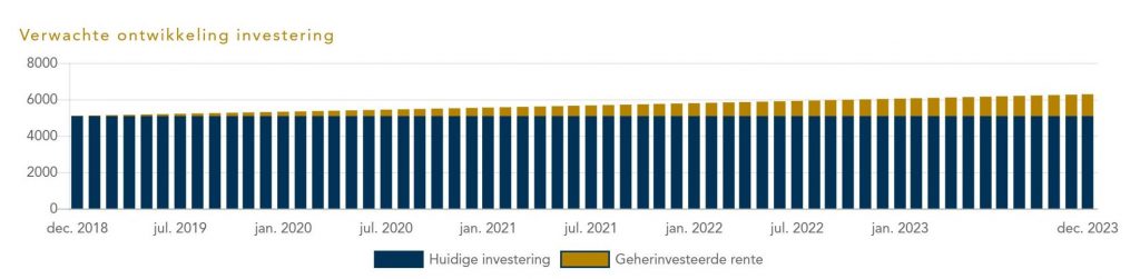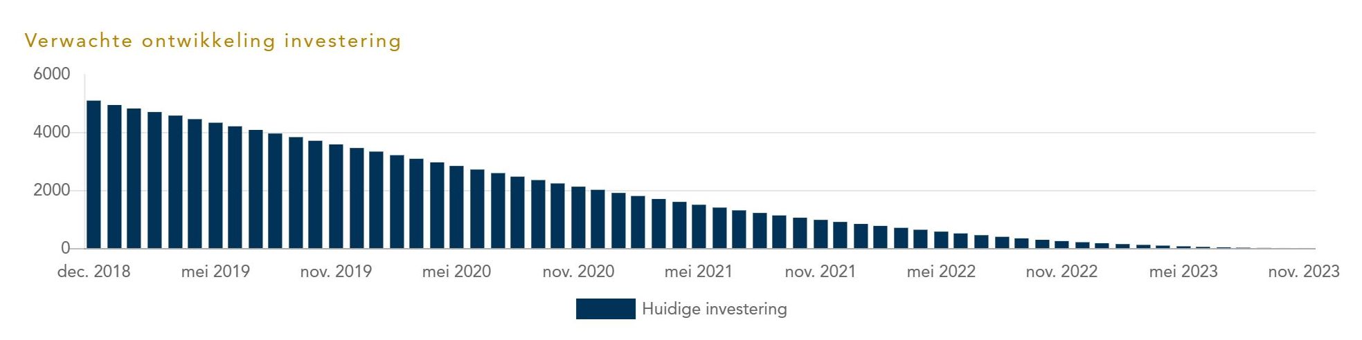 Je kan ook kiezen voor maandelijks uitbetalen. De aflossingen en rente die dan binnenkomt wordt dan elke maand overgemaakt naar je bankrekening. Het effect daarvan is duidelijk te zien aan het verloop van de waarde: